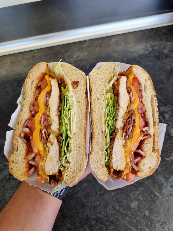 chrupiąca pierś z kurczaka, sos Serowy + sos BBQ, cheddar, boczek, sałata, krążki cebulowe 4sztuki , pomidor -